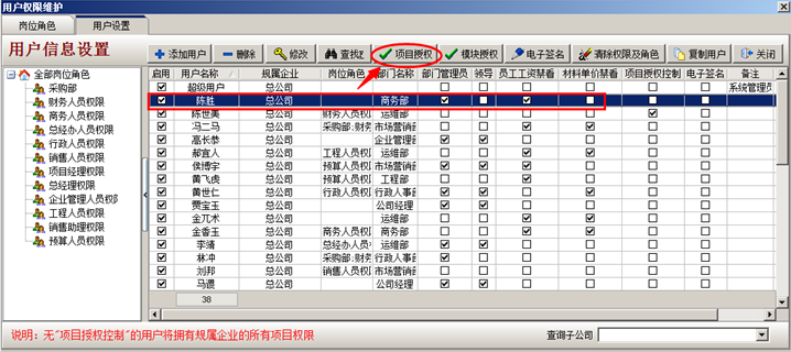 然后陳勝的項目授權(quán),登錄超級用戶----系統(tǒng)維護(hù)----打開用戶管理權(quán)限設(shè)置,選中陳勝,設(shè)置項目授權(quán)