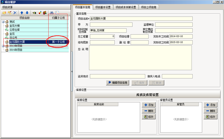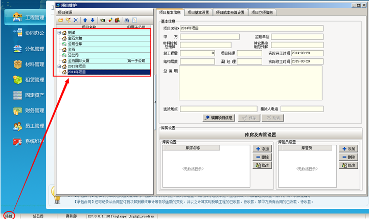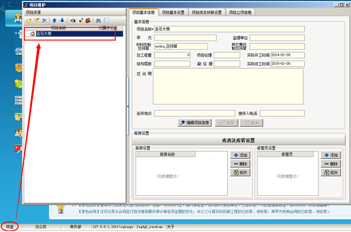 工程管理軟件中設(shè)置完成之后,重新登錄陳勝的賬戶,查看該員工的項目權(quán)限,項目維護(hù)中顯示的項目只有金石大樓這個項目