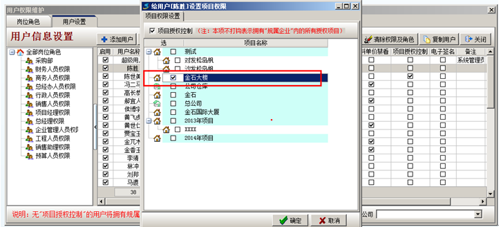 彈出設(shè)置項目授權(quán),以陳勝只有金石大樓這個項目的權(quán)限進(jìn)行項目授權(quán)