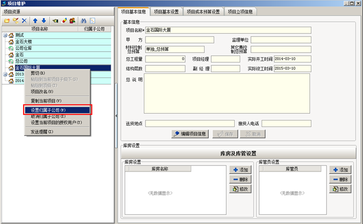選擇項目右鍵單擊,點設(shè)置歸屬子公司,