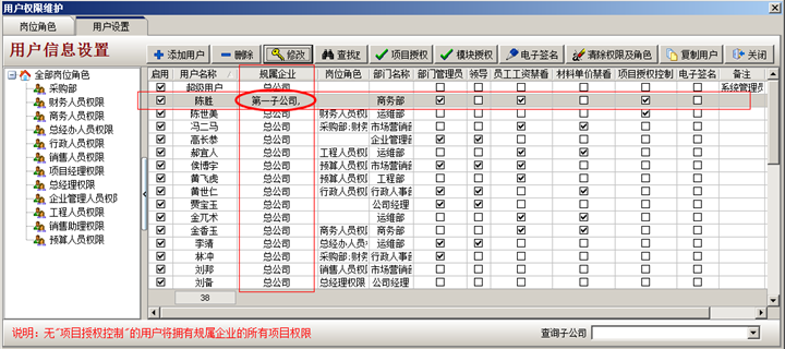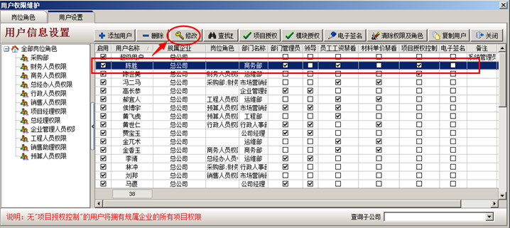 3、工程管理軟件中設(shè)置子公司員工:以員工陳勝為例講解,登錄超級用戶----系統(tǒng)維護(hù)----用戶管理權(quán)限設(shè)置。選中員工陳勝,點修改按鈕