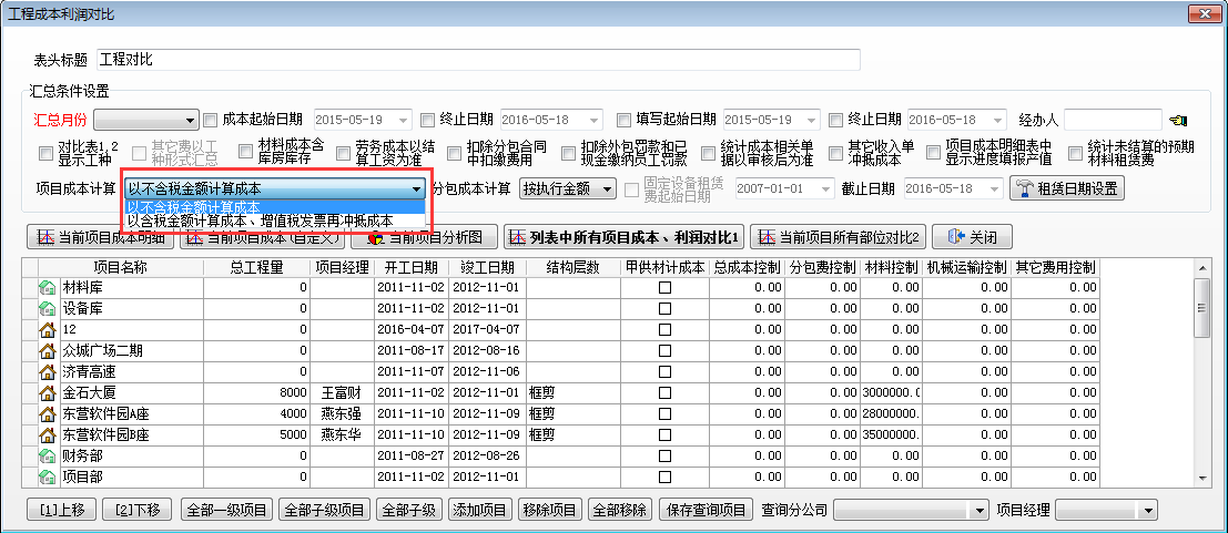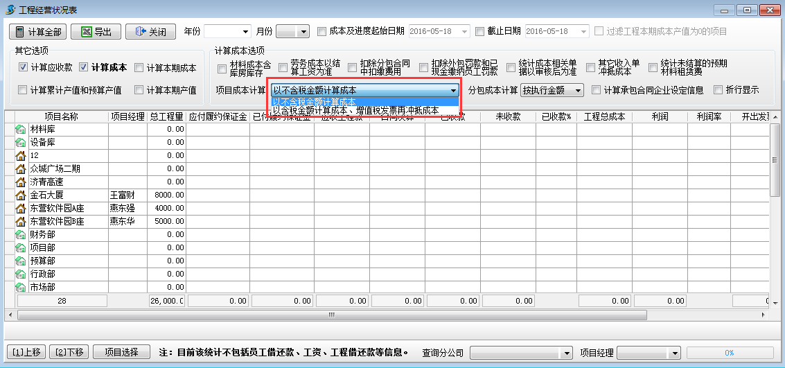 ⑵.營改增后項(xiàng)目成本利潤和工程經(jīng)營狀況表可以選擇以“不含稅金額計(jì)算成本”或者“以含稅金額計(jì)算成本、增值稅發(fā)票在沖抵成本”兩種方式。如下圖:
