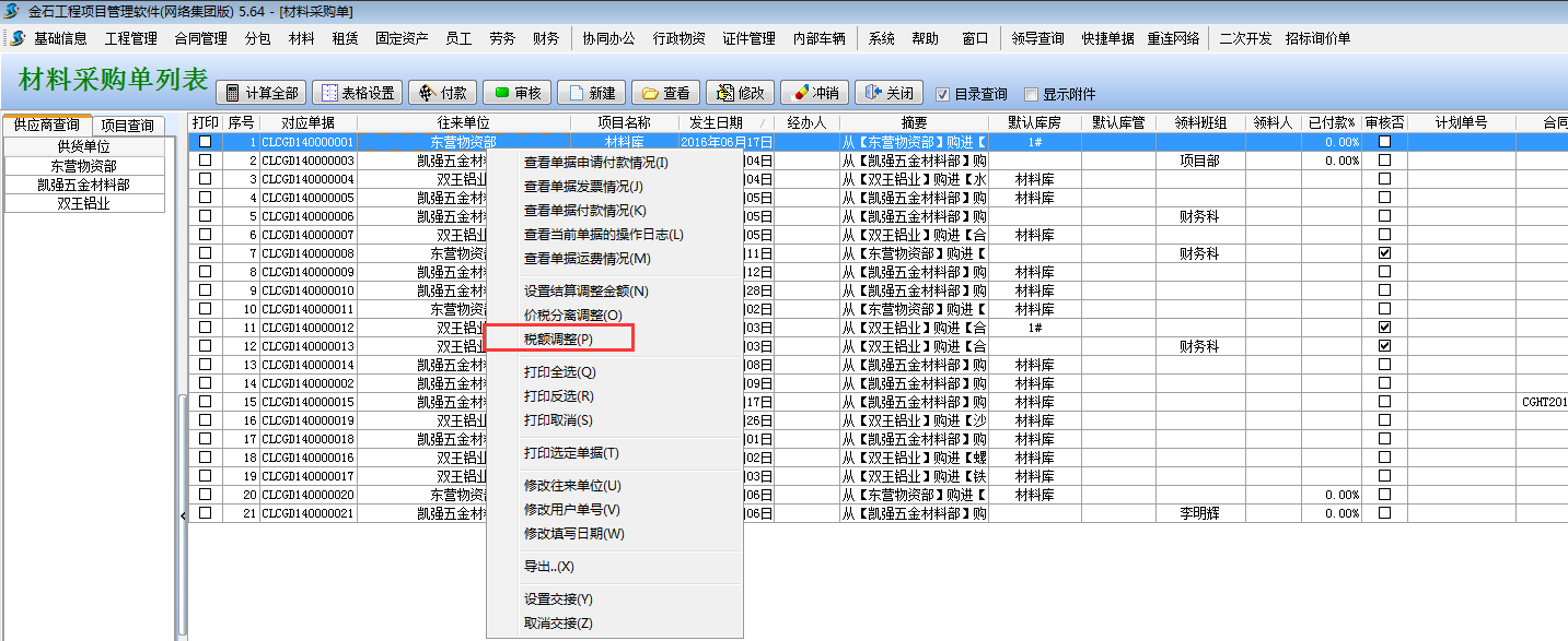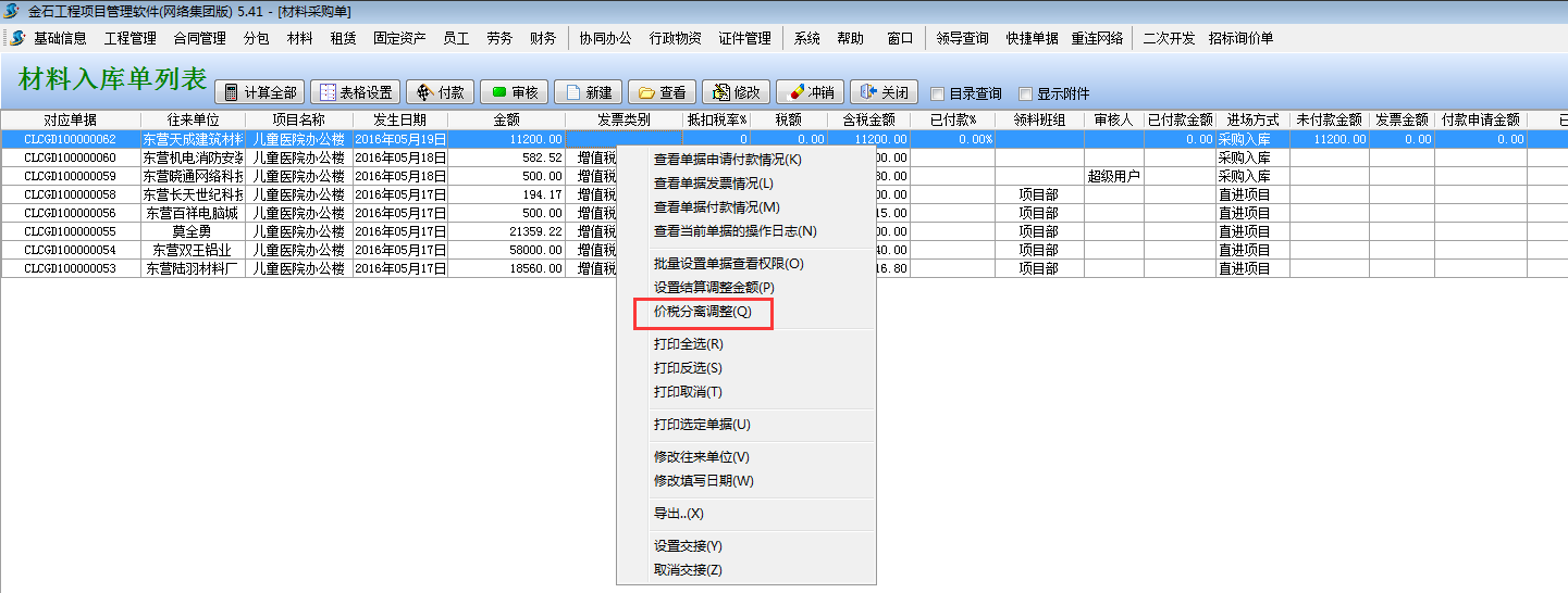 通過工程項(xiàng)目管理軟件價稅分離后,分離出的稅額可能與實(shí)際的稅額有一定的誤差,可通過選定單據(jù)右鍵選擇稅額調(diào)整,實(shí)現(xiàn)對稅額的調(diào)整。如下圖: