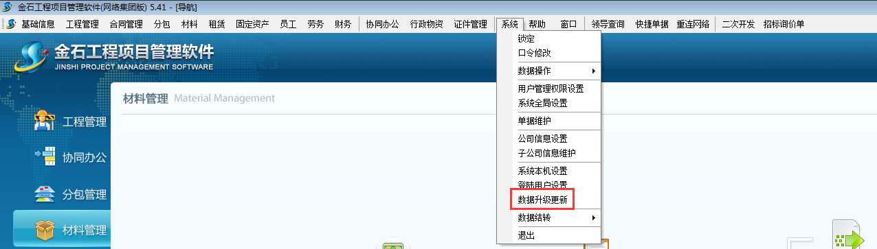 備注:升級到最新版本后,需要登錄超級用戶點(diǎn)擊主菜單【系統(tǒng)】-【數(shù)據(jù)升級更新】。如下圖: