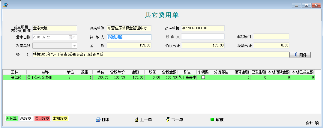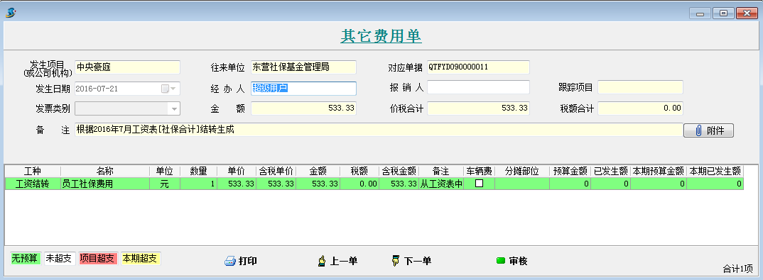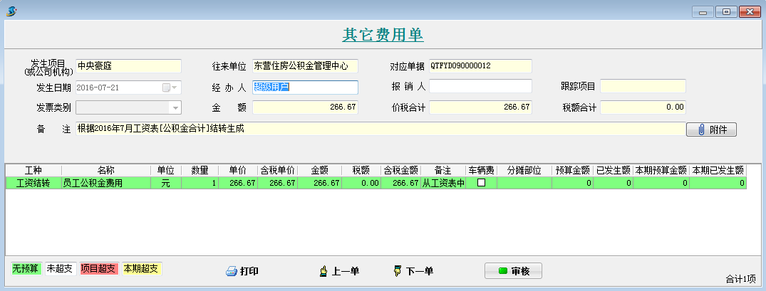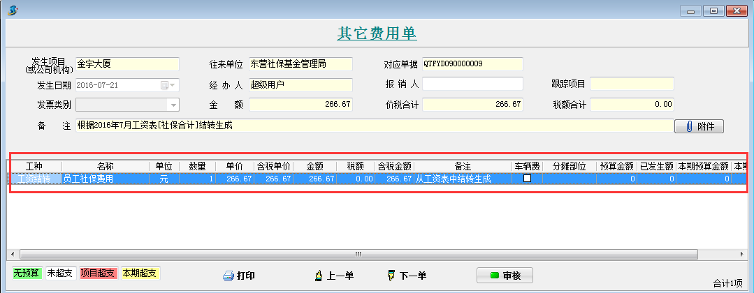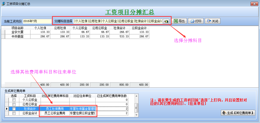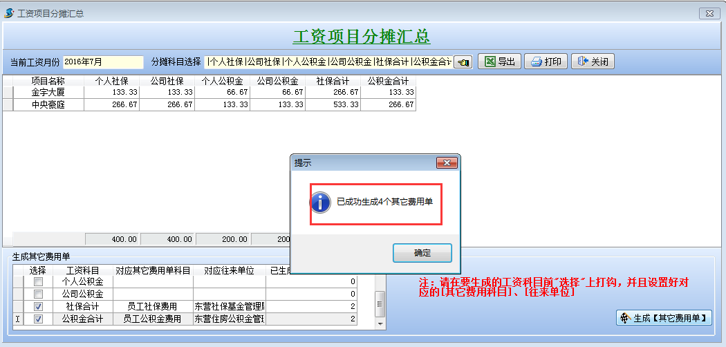 打開待攤費用模塊,選擇好分?jǐn)偪颇?,列表中就會顯示出每個項目分?jǐn)偪蛻舻拿骷?xì)。同時在這個模塊可以直接生成其它費用單,選擇好社保合計和公積金合計的對應(yīng)其它費用單科目和對應(yīng)往來單位,點擊生成工程項目管理系統(tǒng)【其它費用單】,直接可以生成四張其他費用單。
