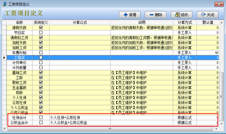 2. 然后在工程項目管理系統(tǒng)【員工管理】-【工資項目定義】設(shè)定好實發(fā)工資的公式和新增社保合計,公積金合計兩個工資科目。其中實發(fā)工資公式中要減去個人社保和個人公積金。如下圖: