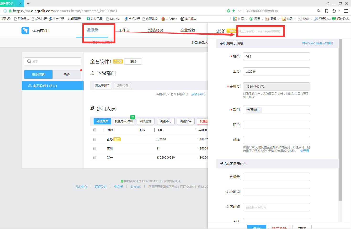 ⑶ 在金石軟件【系統(tǒng)維護(hù)】-【用戶管理權(quán)限設(shè)置】中設(shè)置每個使用用戶的釘釘賬號為釘釘管理后臺中通訊錄成員的員工UserlD。