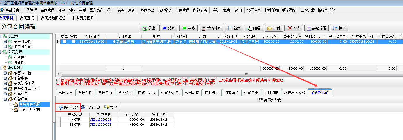 在工程項目管理軟件【分包合同】-【墊支款記錄】處選擇執(zhí)行收款,或者在【財務(wù)管理】-【付款單收款單】新建收款單選擇墊資款收款。