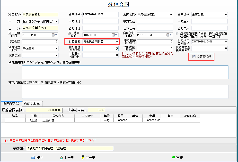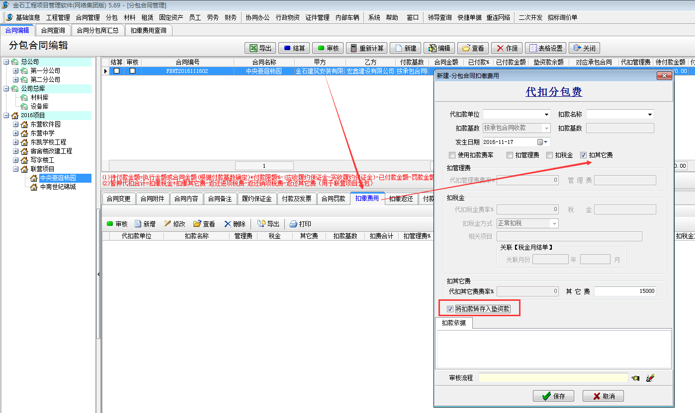 在建立分包合同時可選擇在“付款前扣款”處打鉤,這樣在付款前,必須做扣繳費用才能付款,避免有忘記扣款的情況。具體參見文章“分包合同付款前扣款的使用”