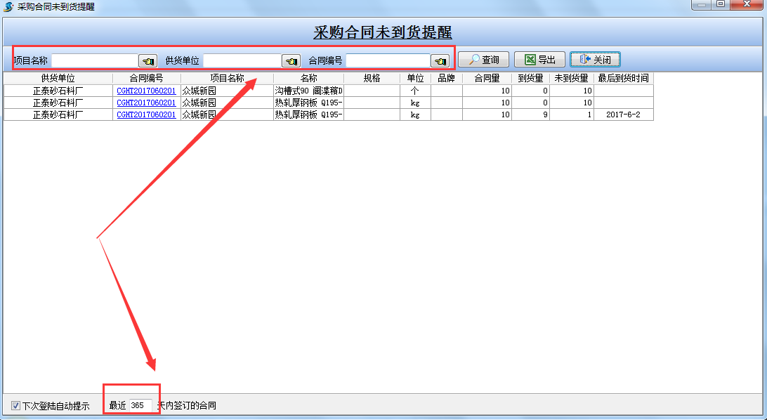 可根據(jù)項(xiàng)目名稱、供貨單位、合同編號,按照時間檢索一定時間段內(nèi)的合同未到貨信息 如下圖: