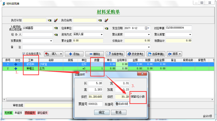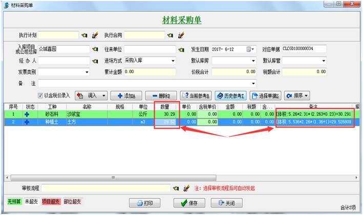 備注 如上圖所示:在備注欄中系統(tǒng)不但會(huì)自動(dòng)彈出材料的計(jì)算方式,而且在數(shù)量一欄中只保留2位小數(shù),并將第三位以后的數(shù)字舍去,以幫助公司節(jié)省開支