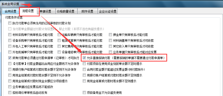 流程設置→允許直接報銷付款打鉤(需要報銷的單據(jù)不需要通過付款申請單)