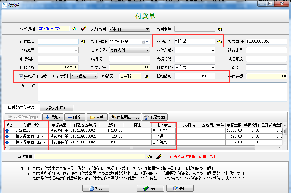 在工程項目管理軟件中如果某個員工在多個項目任職,又有多個往來單位都產(chǎn)生業(yè)務往來,都要進行報銷付款(沒有對應合同的前提下),按住ctrl鍵選擇待付款的單據(jù)(需單據(jù)的經(jīng)辦人是相同的)