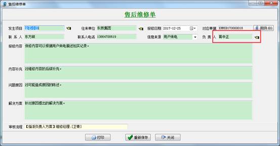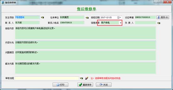 分管員接到用戶電話,根據(jù)用戶的描述手動添加【售后維修單】,填寫必要內(nèi)容,如發(fā)生項目,單位名稱,報修的內(nèi)容等,然后選擇審核流程方案,提交給售后部門經(jīng)理審批。