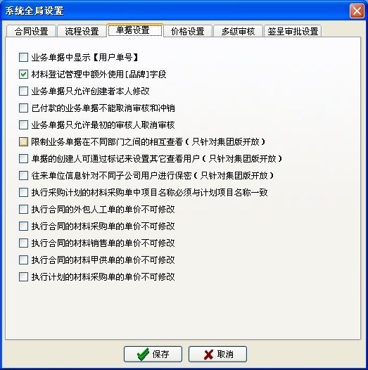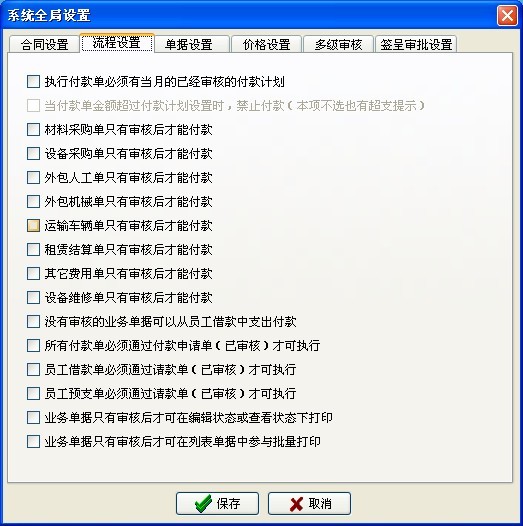 四、進(jìn)行【全局設(shè)置】,用戶要根據(jù)自己公司的實(shí)際情況進(jìn)行設(shè)置,多余的控制流程要去除,需要的要打鉤。如下圖: