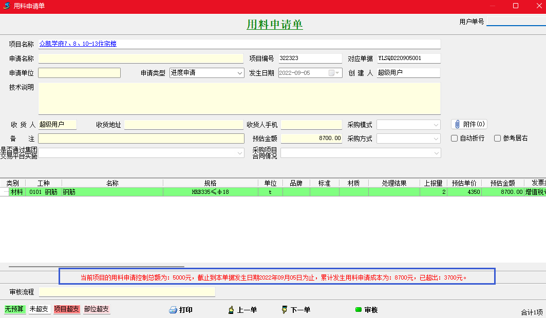 保存用料申請(qǐng)單超出控制金額會(huì)自動(dòng)提示。