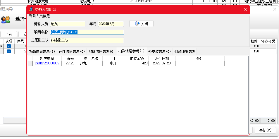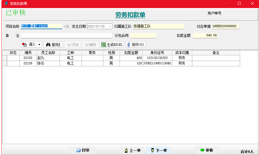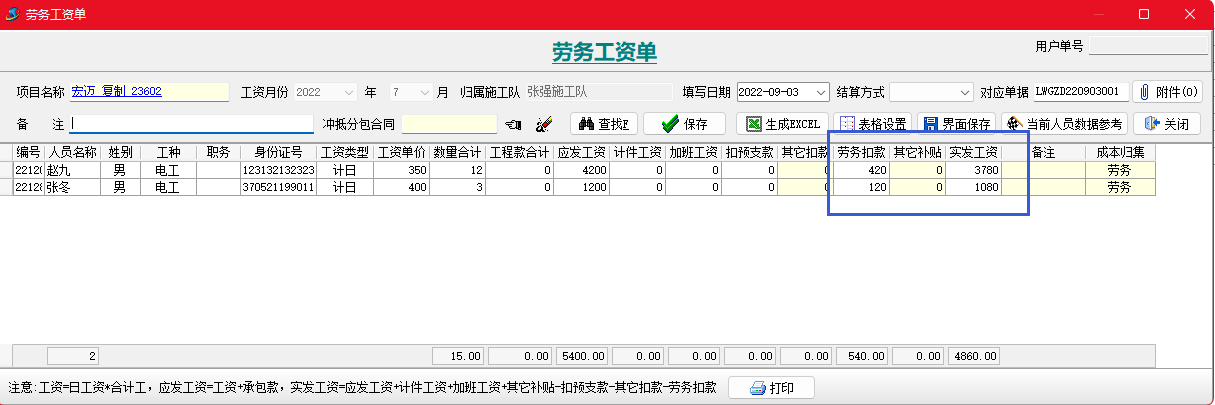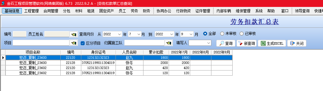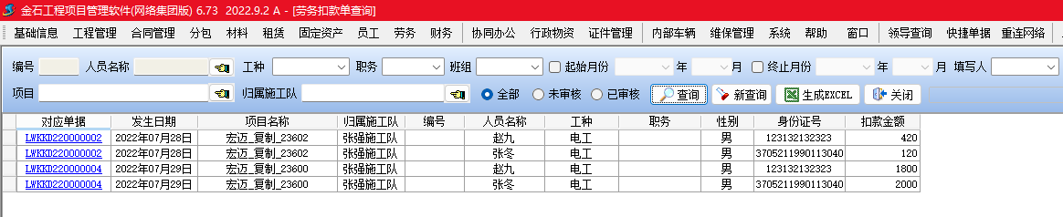 金石項目管理軟件增加勞務(wù)扣款單,可以按人填寫勞務(wù)工人扣款信息,并生成勞務(wù)工資表。