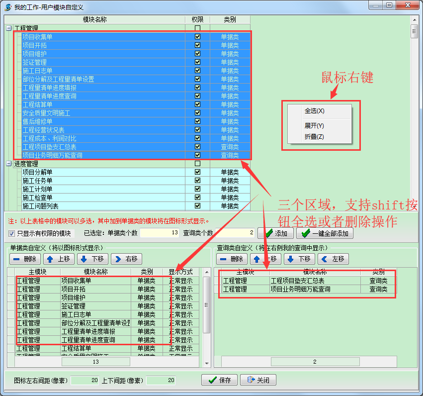 (2)上方選擇區(qū)域、下方的單據(jù)類自定義和查詢類自定義區(qū)域中,都支持shift鍵 全選 操作。此外有一鍵添加所有功能的按鈕在。