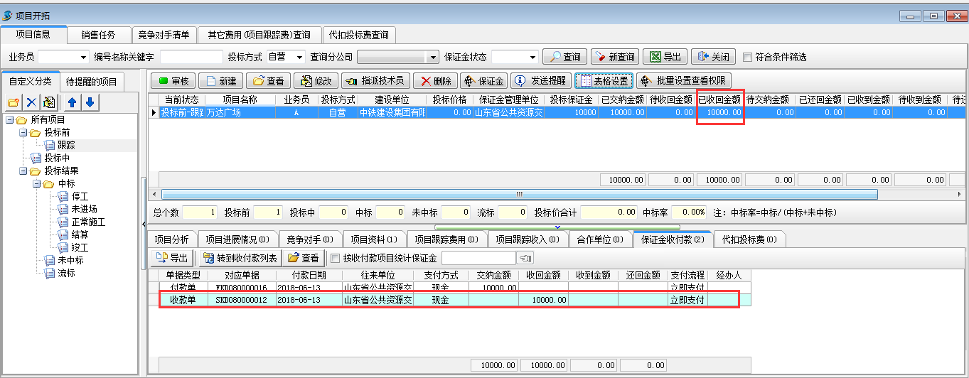保證金收回,工程管理軟件的項(xiàng)目開拓中會(huì)顯示“已收回金額”為收款金額,待收回金額會(huì)減去已收回金額,“保證金”收付款中會(huì)有對(duì)應(yīng)的收款記錄,如圖:
