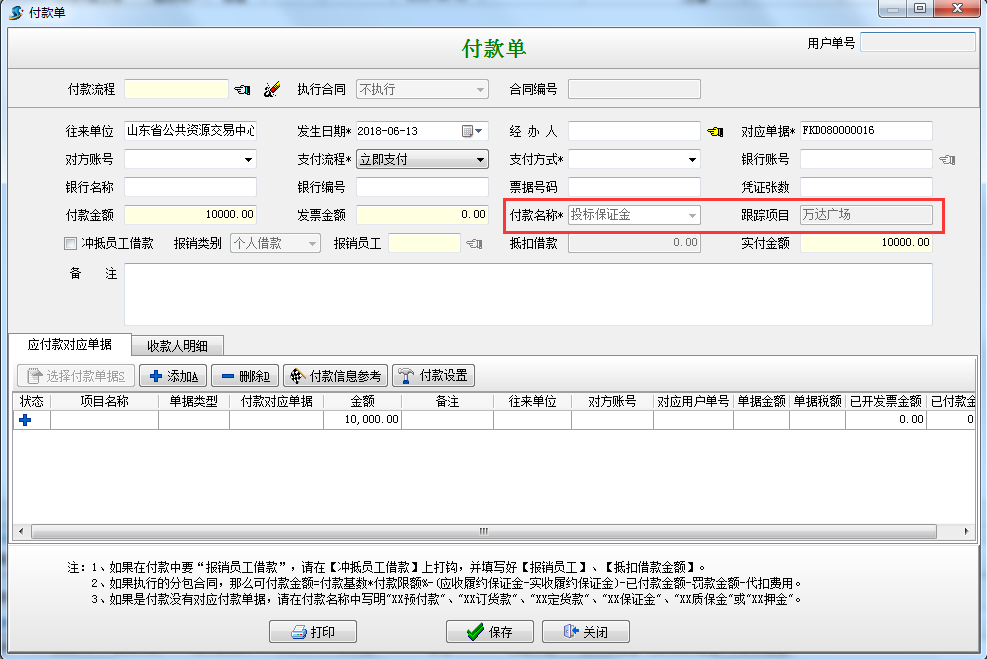 交納投標(biāo)保證金時(shí)填寫“付款申請(qǐng)單”或者“付款單”,(如果填寫的是付款申請(qǐng)單則在付款申請(qǐng)單審核通過(guò)之后進(jìn)行付款),如圖: