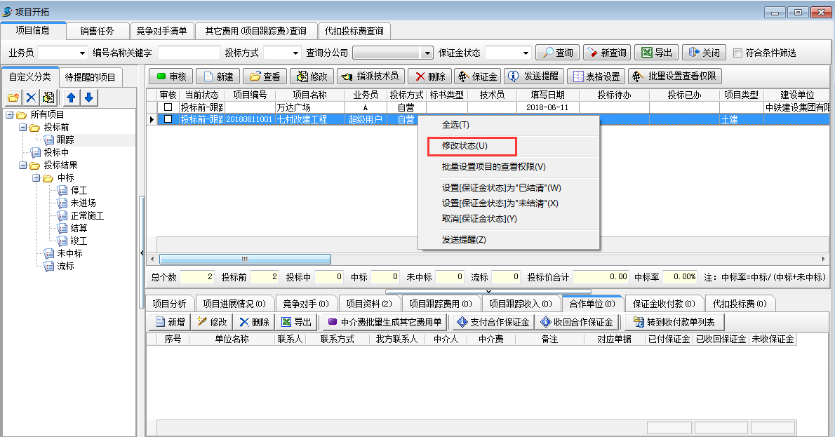 投標(biāo)結(jié)果出來(lái)以后,將狀態(tài)改到“投標(biāo)結(jié)果”的狀態(tài),如圖: