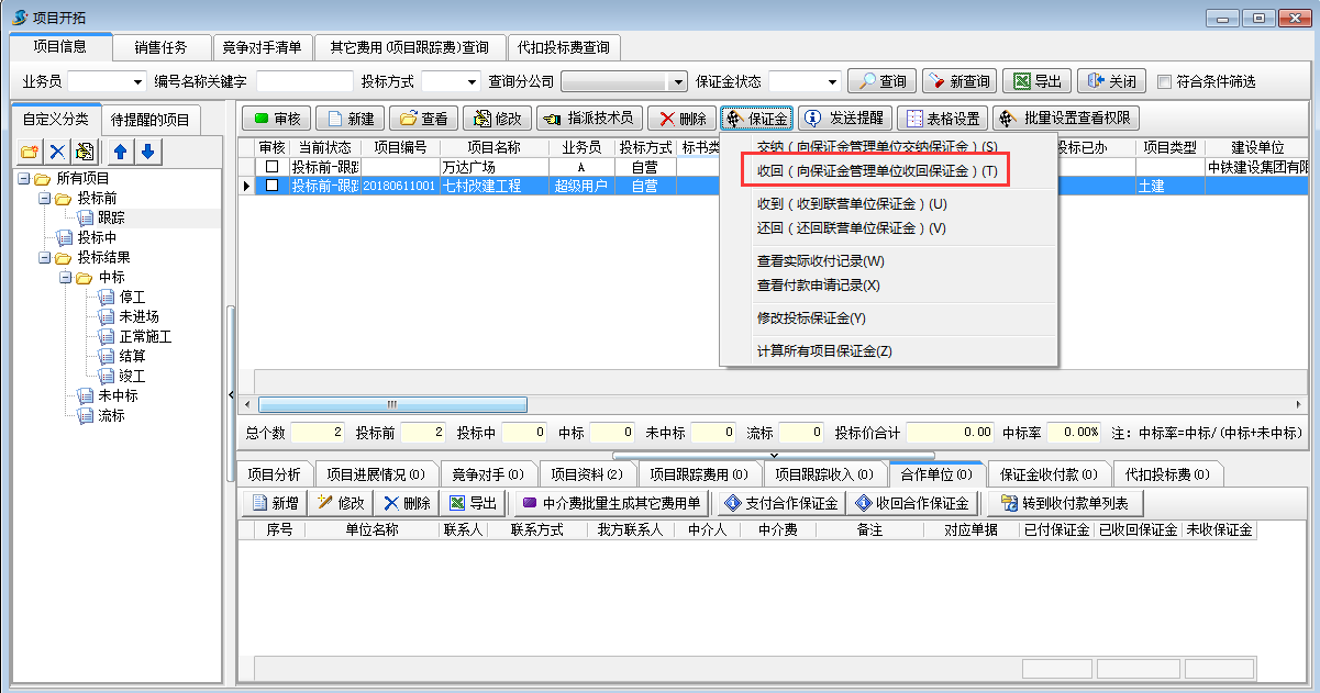 我方要從“保證金管理單位”將投標(biāo)保證金收回。工程管理軟件的項(xiàng)目開拓中選中對(duì)應(yīng)的項(xiàng)目,在“保證金”菜單中選擇“收回”,如圖所示: