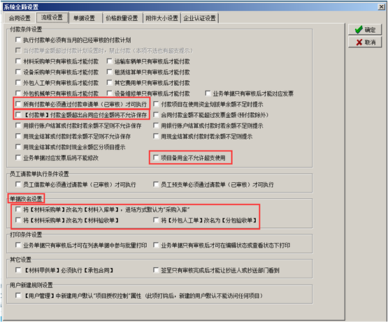 進(jìn)入系統(tǒng)的“系統(tǒng)維護(hù)”-“系統(tǒng)全局設(shè)置”彈出系統(tǒng)全局設(shè)置的對(duì)話框,點(diǎn)擊“合同設(shè)置”,在對(duì)應(yīng)的復(fù)選框打鉤代表合同受對(duì)應(yīng)開(kāi)關(guān)的控制,如圖: