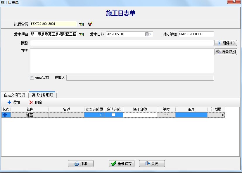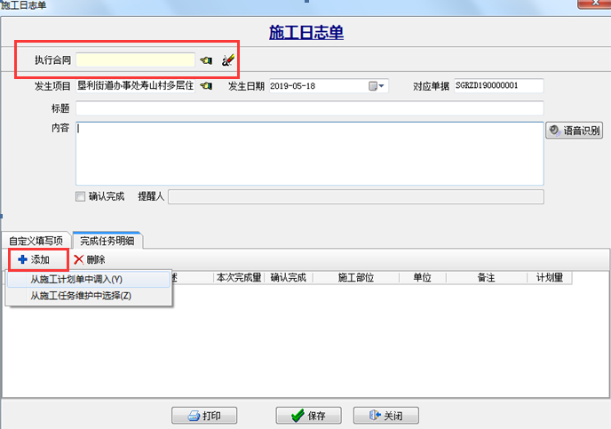 2、點“添加”可以從“施工計劃單”或“施工任務(wù)維護(hù)”中調(diào)入并填報完成量