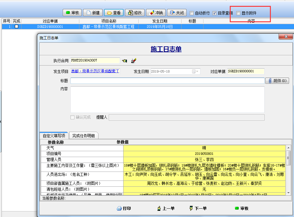 三、填報“施工日志單”根據(jù)自定義的字段 輸入相對應(yīng)的內(nèi)容,點下圖中的“顯示附件”添加施工現(xiàn)場的圖片。
