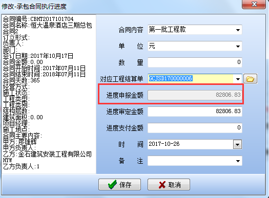 4.填寫(xiě)“承包合同”執(zhí)行進(jìn)度,對(duì)應(yīng)工程結(jié)算清單,(下圖)“進(jìn)度申報(bào)金額”就是在工程結(jié)算單中填寫(xiě)的暫估收款金額,“進(jìn)度審定金額”就是報(bào)給甲方審定后的最終收入金額