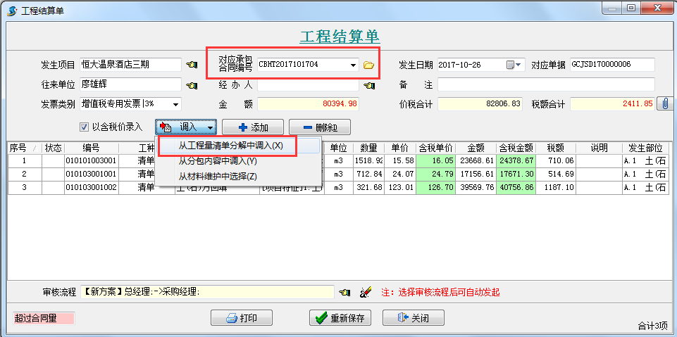 3.做工程結(jié)算單(暫估收入)對(duì)應(yīng)承包合同編號(hào),調(diào)入上圖中做好的“部位分解”中的清單內(nèi)容