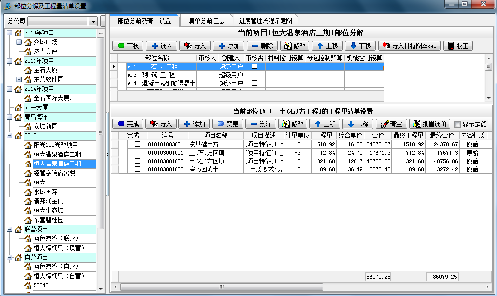 2.合同建立完成后,對(duì)項(xiàng)目進(jìn)行部位的分解(支持導(dǎo)入廣聯(lián)達(dá)、智多星等主要清單軟件做出的工程量清單直接導(dǎo)入到軟件內(nèi),也可以根據(jù)軟件的格式編輯EXCEL表格進(jìn)行導(dǎo)入)
