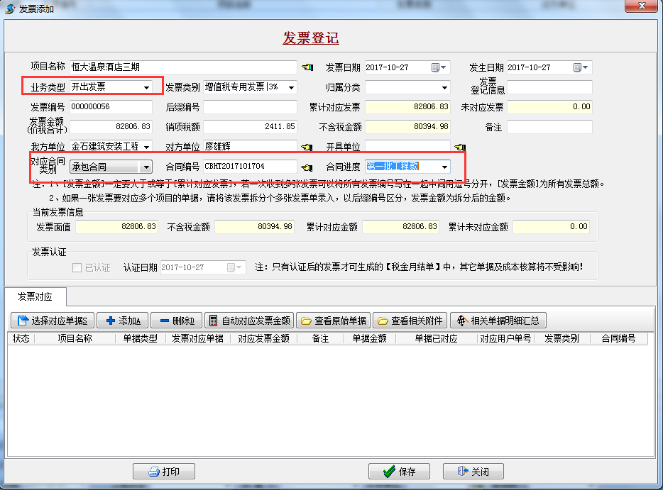 發(fā)票登記有多處需要注意,“業(yè)務(wù)類型”為開(kāi)出發(fā)票(銷項(xiàng)稅),對(duì)應(yīng)“承包合同”、“合同編號(hào)”和“合同進(jìn)度”。