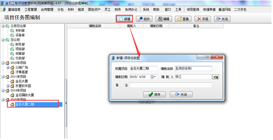 進入系統(tǒng)的“項目管理”模塊,點擊“項目任務圖編制”,點擊“新建”按鈕保存,(便于后期進行工程項目施工進度的管理)如圖:
