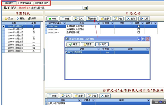 A添加施工日志:首先選擇項目名稱,在“日期列表”下點“添加”按鈕,選擇日期。然后在右側(cè)的“日志文檔”下新建一個日志文檔,然后選擇“編輯”按鈕,選擇一個“日志模板”建立日志文件可記錄工程項目施工進度。也可以直接導入已寫好的現(xiàn)成日志文檔到軟件中,或者將 寫在日記本的日志用數(shù)碼相機或掃描儀做成圖片格式直接導入到軟件中。