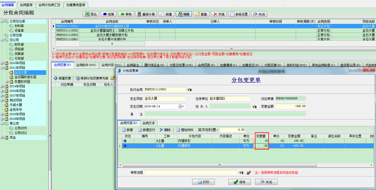 如遇到合同變更或者分包簽證的情況,就會(huì)用到【分包變更單】,如下圖