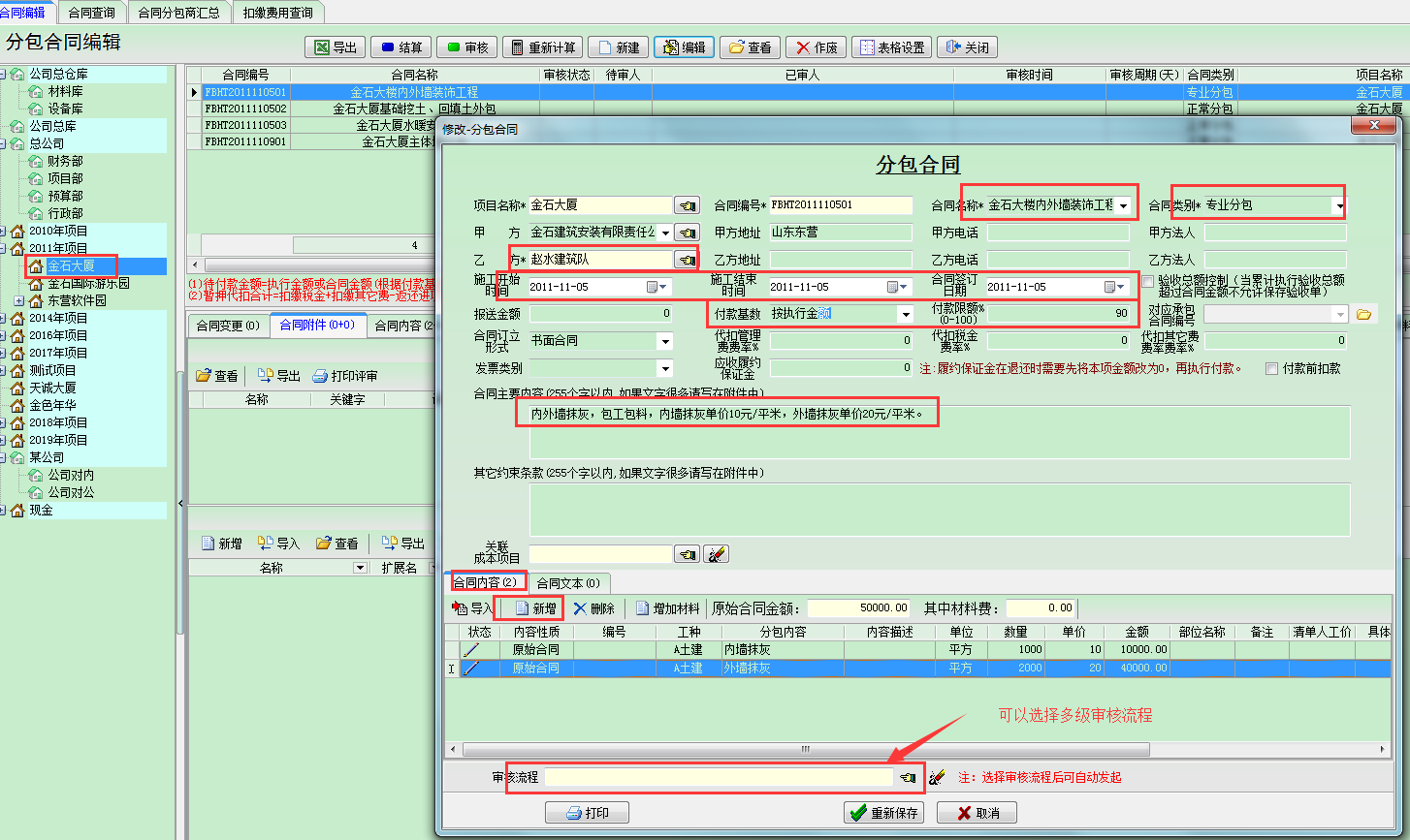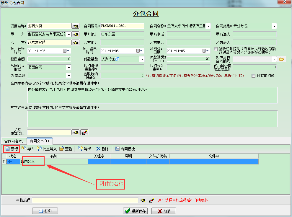 選中[金石大廈]項(xiàng)目點(diǎn)擊【新建】來建立一個(gè)合同,界面如下:
