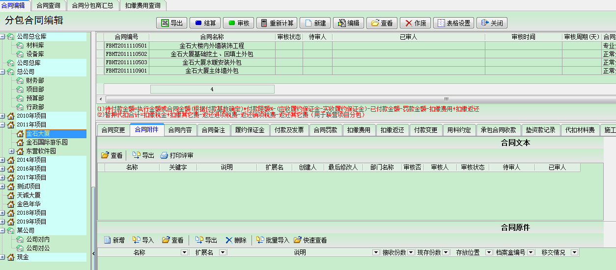 在【合同編輯】中左半部分是合同的分類,分包合同也是按【項(xiàng)目維護(hù)】進(jìn)行分類管理的。一個(gè)項(xiàng)目下可以建立多個(gè)合同,窗口的右上部分是合同列表,一行信息代表一個(gè)合同。右下部位是當(dāng)前合同相關(guān)的內(nèi)容:【合同附件】、【合同內(nèi)容】、【合同備注】、【履約保證金】、【合同提醒】、【合同付款及相關(guān)發(fā)票】、【合同罰款】、【扣繳費(fèi)用】、【合同材料約定】、【資質(zhì)管理】、【合同借閱】。