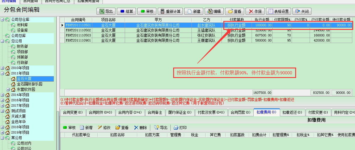 在工程項目管理中,工程款含甲供材費用的情況經(jīng)常會遇到,若總包方對外分包而且分包款也是包含甲供材費用的話,同樣的在分包管理中就應該在分包工程款中扣除相應的甲供材費用?;蛘呶曳浇o分包商提供材料。為此金石工程項目管理軟件中做出相應的解決方案,以下為示例說明