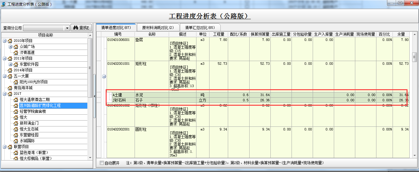 【編號(hào)、名稱、描述、單位、工程量、配比/系數(shù)】是根據(jù)軟件中部位分解及工程量清單設(shè)置得來的;【換算預(yù)算量】是根據(jù)工程量*配比/系數(shù);【出庫施工量】是根據(jù)做的材料出庫單或者材料調(diào)撥單出庫清單成本材料;【分包驗(yàn)收量】是根據(jù)做的外包人工單計(jì)算得來的; 【生產(chǎn)入庫量】是根據(jù)做的材料加工單成品材料得來;【生產(chǎn)消耗量】是根據(jù)是根據(jù)做的材料加工單原材料得來;【現(xiàn)場使用量】是根據(jù)做的材料出庫單或者材料調(diào)撥單出庫原材料;【百分比】是根據(jù)出庫施工量/換算預(yù)算量;【余量】:第一級(jí)清單余量=換算預(yù)算量-(出庫施工量+分包驗(yàn)收量),第二級(jí)、材料余量=換算預(yù)算量-(生產(chǎn)消耗量+現(xiàn)場使用量)。