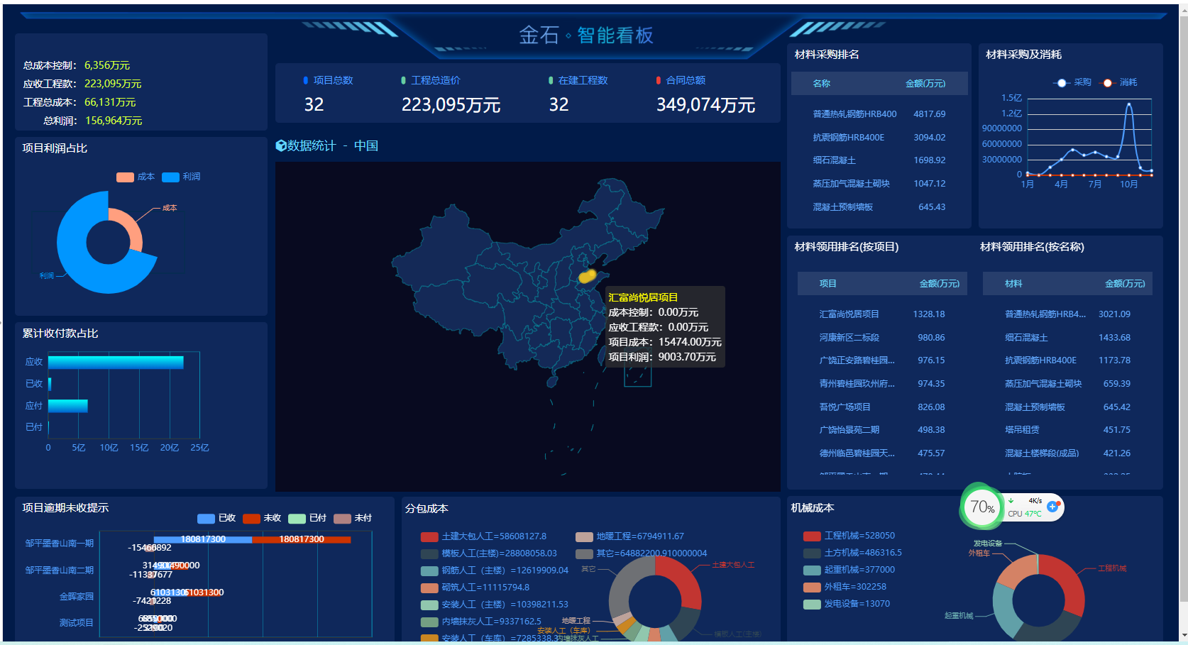 【項(xiàng)目利潤占比】能夠自動(dòng)分析出實(shí)際成本與利潤之間的比對(duì)。