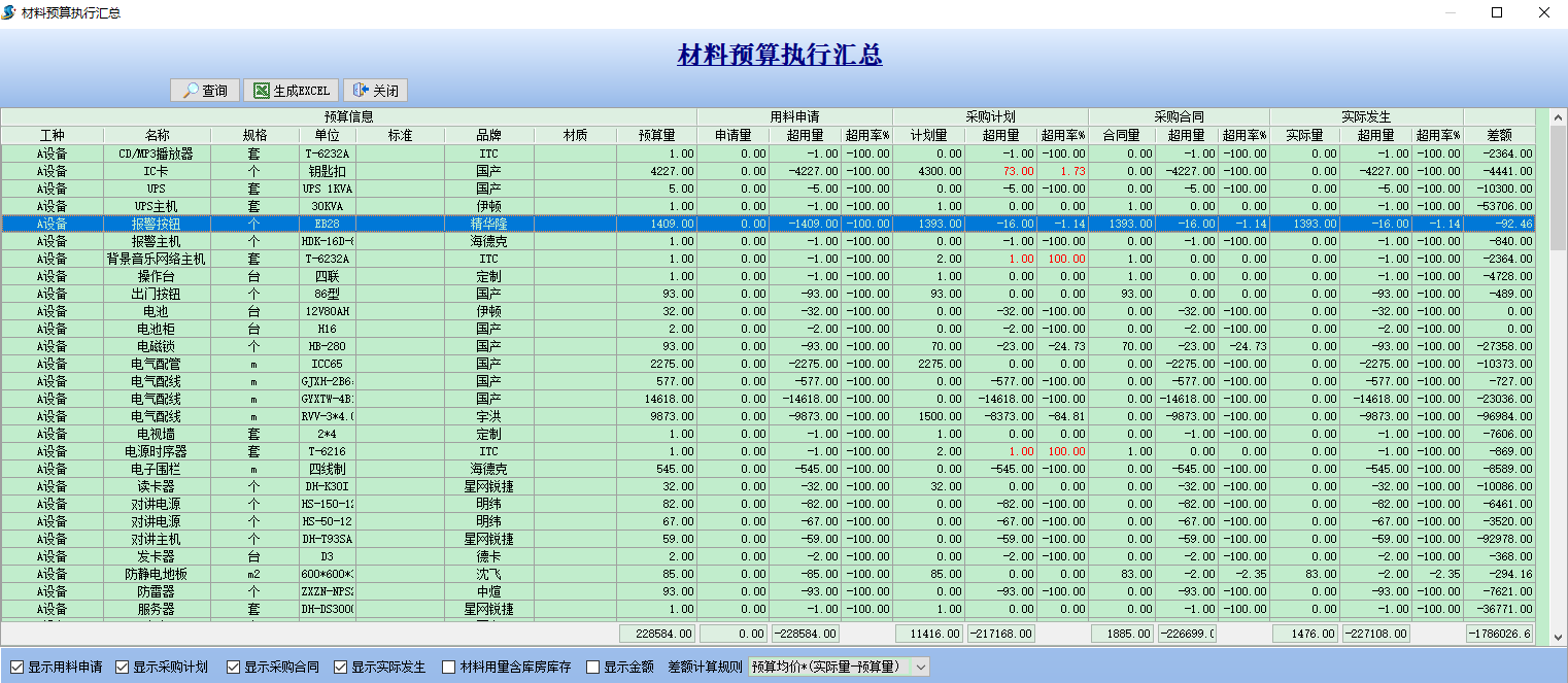 如果想全面統(tǒng)計(jì)材料用料申請、采購計(jì)劃、采購合同及實(shí)際發(fā)生等詳細(xì)情況,可以通過材料預(yù)算執(zhí)行匯總來查看,如下圖所示: