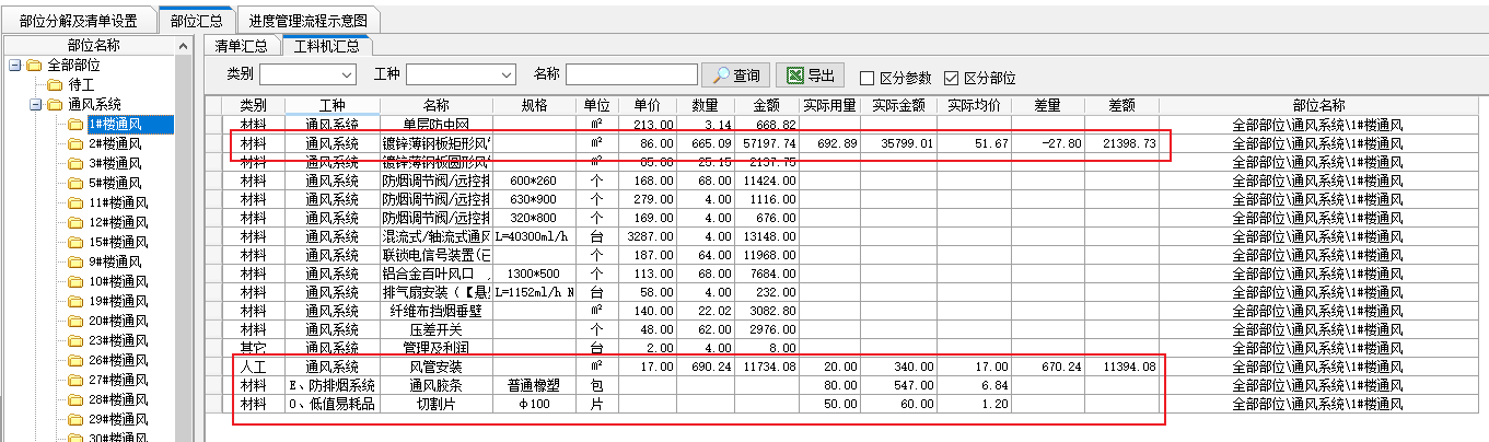 通過部位匯總這個界面,我們可以看到材料預算與實際用量的對比以及預算金額與實際金額的對比,便于實時掌控成本的發(fā)生或超預算、超預算金額的情況。