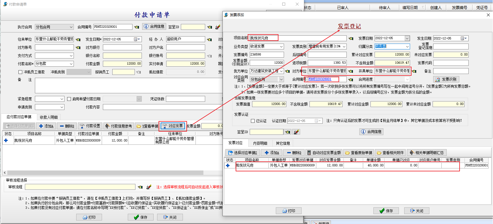 付款申請(qǐng)單界面可以直接做發(fā)票登記,做付款申請(qǐng)時(shí),可以打開發(fā)票登記界面即可錄入發(fā)票信息,省去了在付款申請(qǐng)?zhí)峤磺?,先做發(fā)票登記的步驟,點(diǎn)擊對(duì)應(yīng)發(fā)票,可以帶入項(xiàng)目名稱、對(duì)方單位、開具單位和合同編號(hào)等字段,下方明細(xì)表可以從付款申請(qǐng)單帶入對(duì)應(yīng)的單據(jù)信息,如下圖所示: