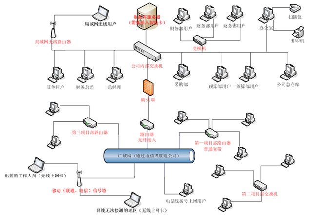 《金石建筑工地管理系統(tǒng)》在綜合了建筑企業(yè)在網絡辦公要求后,實結合了該公司的實際需求建立了如上圖所示的公司辦公平臺。在硬件上,使用最經濟、性價比較高、安全性很強的設備建立既能滿足公司現(xiàn)階段需求有能符合將來一段時間內的信息化需要的硬件設施,并為公司以后硬件及信息化發(fā)展預留充裕的空間及相關接口。在軟件上建立專門的對內和對外的信息通道,對內串聯(lián)公司各科室部門,對項目部進行有效監(jiān)管,并為項目部提供高效的上報及反應通道,實現(xiàn)公司內部的信息高速互通;對外建立公司的信息發(fā)布平臺,及時的為公司相關外來的單位發(fā)布公司及項目信息。