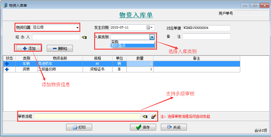 點擊主菜單中的【行政物資】->【物資入庫單】打開物資入庫單列表 點【新建】按鈕,錄入如下: