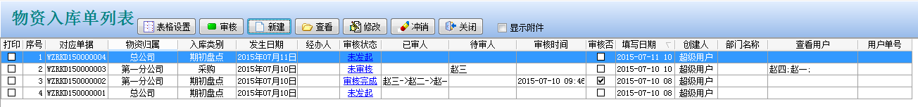 保存后返回到【物資入庫單列表】中,如下圖: