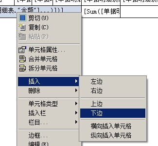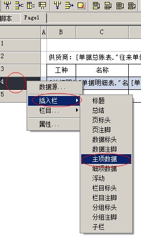 我們首先在左側(cè)第4行點(diǎn)擊鼠標(biāo)右鍵,選擇插入欄(第一次使用,欄目中沒(méi)有,要選擇插入。第二次使用,在欄目中選擇),選擇【主項(xiàng)數(shù)據(jù)】。在彈出的窗口中選擇【單據(jù)明細(xì)表】。如下面兩張圖: