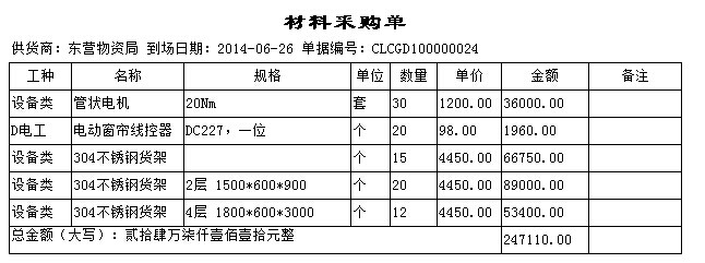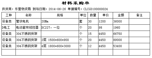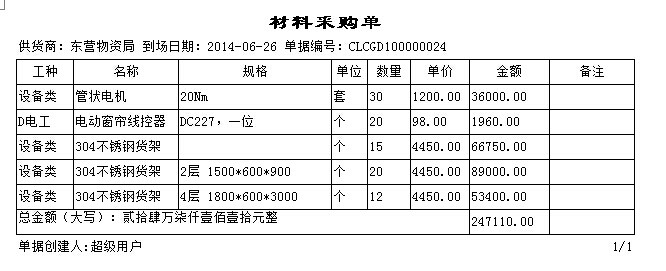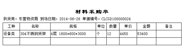 以下圖中單據(jù)(材料采購(gòu)單)為例,新建一個(gè)打印報(bào)表。