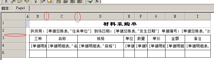 7. 把單據(jù)中需要打印的內(nèi)容,放入表格中。例如:材料的工種,名稱、規(guī)格、單位、數(shù)量、單價(jià)、金額、備注等,如下圖,在第三行中我們輸入名稱,第三行中輸入對(duì)應(yīng)的字段名稱。